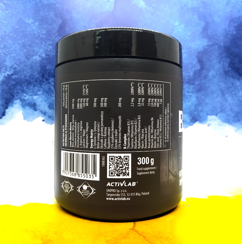 Продукт "Activlab Black Wolf" розроблений з урахуванням останніх тенденцій у галузі спортивного харчування та містить багато популярних та ефективних інгредієнтів. У його складі є аргінін, бета-аланін, тирозин і кетони малини, які є дійсно робочими компонентами.