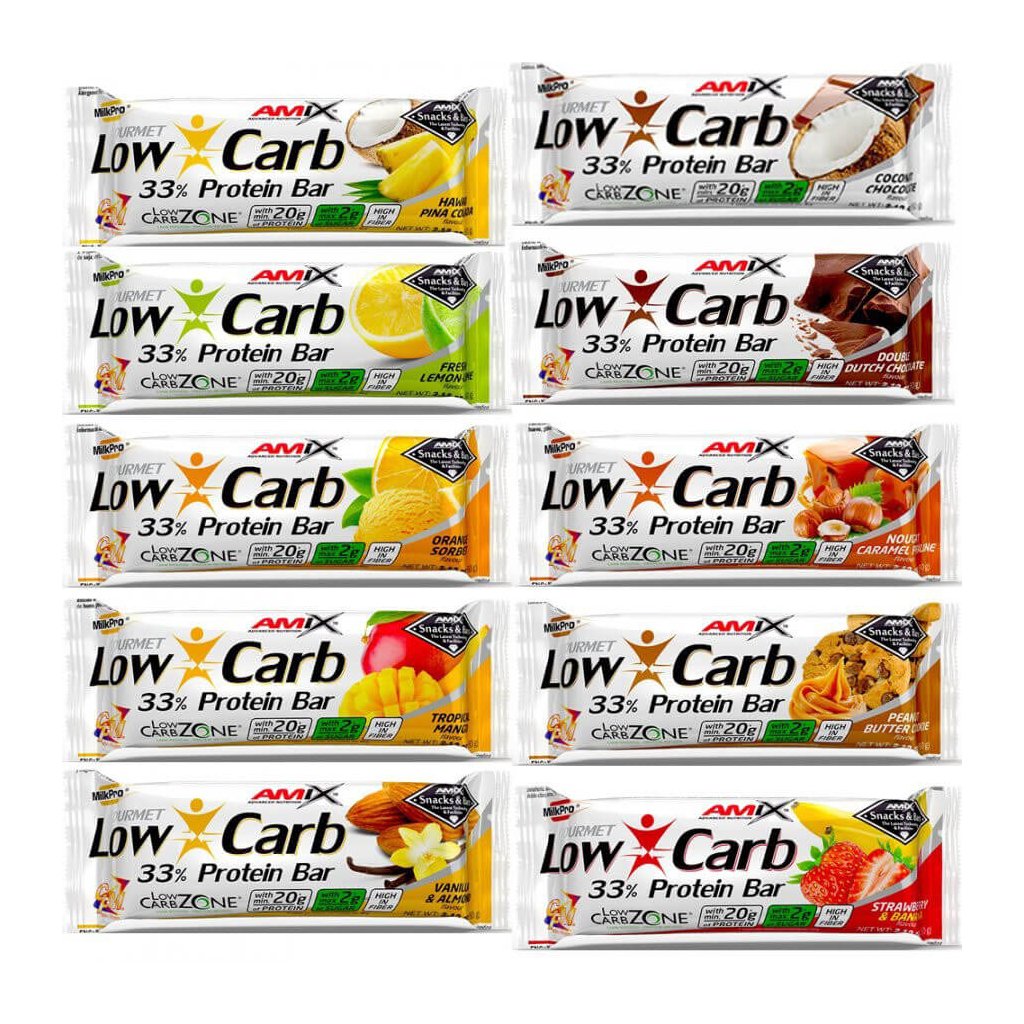 Протеїновий батончик з високою концентрацією білка (33%), низьким вмістом вуглеводів та цукру. Amix Low-Carb 33% Protein Bar відноситься до низькокалорійних продуктів, містить клітковину і добре втамовує голод.
