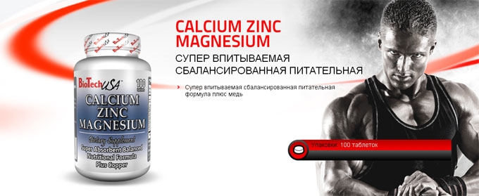 Одна з найбільш популярних і затребуваних вітамінних добавок для спортсменів на сьогоднішній день, Calcium Zinc Magnesium - це комплекс з 3 найважливіших для здоров'я організму мінералів - кальцію, магнію і цинку від популярного американського виробника спортивних харчових добавок, компанії Biotech USA. Створено добавку саме в такому зв'язуванні тому, що дані мінерали у великій кількості витрачаються організмом під час інтенсивних тренувань, і є дуже важливими не тільки для спортсменів, а й взагалі для будь-якої людини, яка дбає про стан свого здоров'я. Основні цілі вживання кальцій магній вітамінів – це якісне підвищення імунітету, міцності кісток, а також зниження судом (особливо в литкових м'язах).