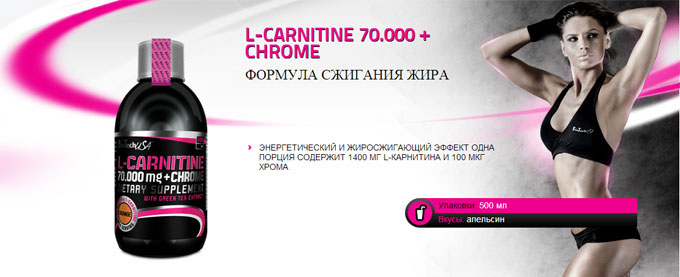 Левокарнітин, як ви розумієте, є головним діючим компонентом Biotech L-Carnitine 70.000+Chrome, і як уже було неодноразово доведено, транспортує жири в мітохондрії клітин, щоб ті перетворювалися на енергію, використовуючи яку на кардіо-тренуванні ви досягнете її знищення. Використання карнітину допоможе Вам покращити свою статуру, зробити її рельєфною і привабливішою звичайно у поєднанні зі спортивними навантаженнями та низьковуглеводним харчуванням. Також l carnine використовують для прискорення метаболізму, який відповідає за швидкість та якість обміну речовин. Для когось це мінус, оскільки посилиться апетит, а насправді це величезний плюс, оскільки коли у Вас "притуплений" метаболізм, то, крім відсутності апетиту, організм ще й не відпускає свої жирові резерви навіть голодуючи і сильно тренуючись.