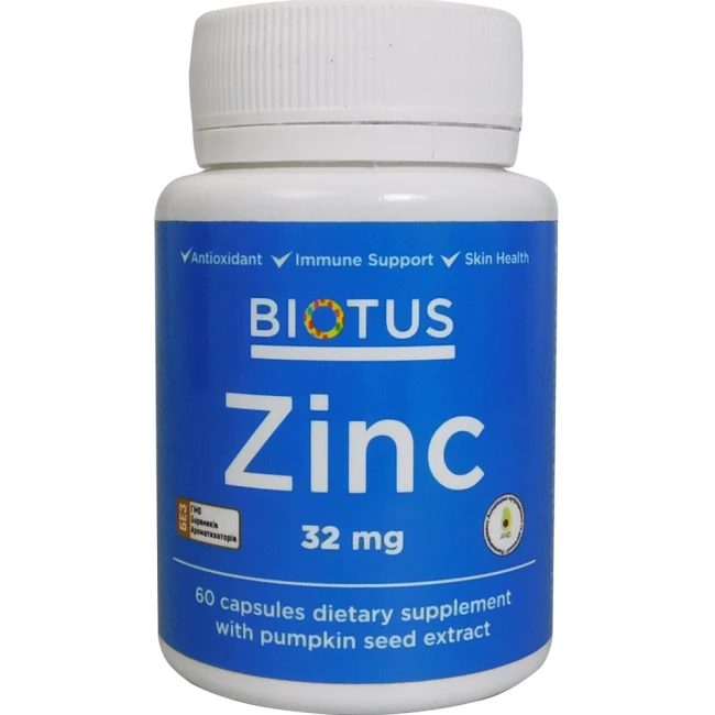 Цинк від українського бренду Biotus є джерелом натурального цинку (з екстракту гарбузового насіння) і оксиду цинку