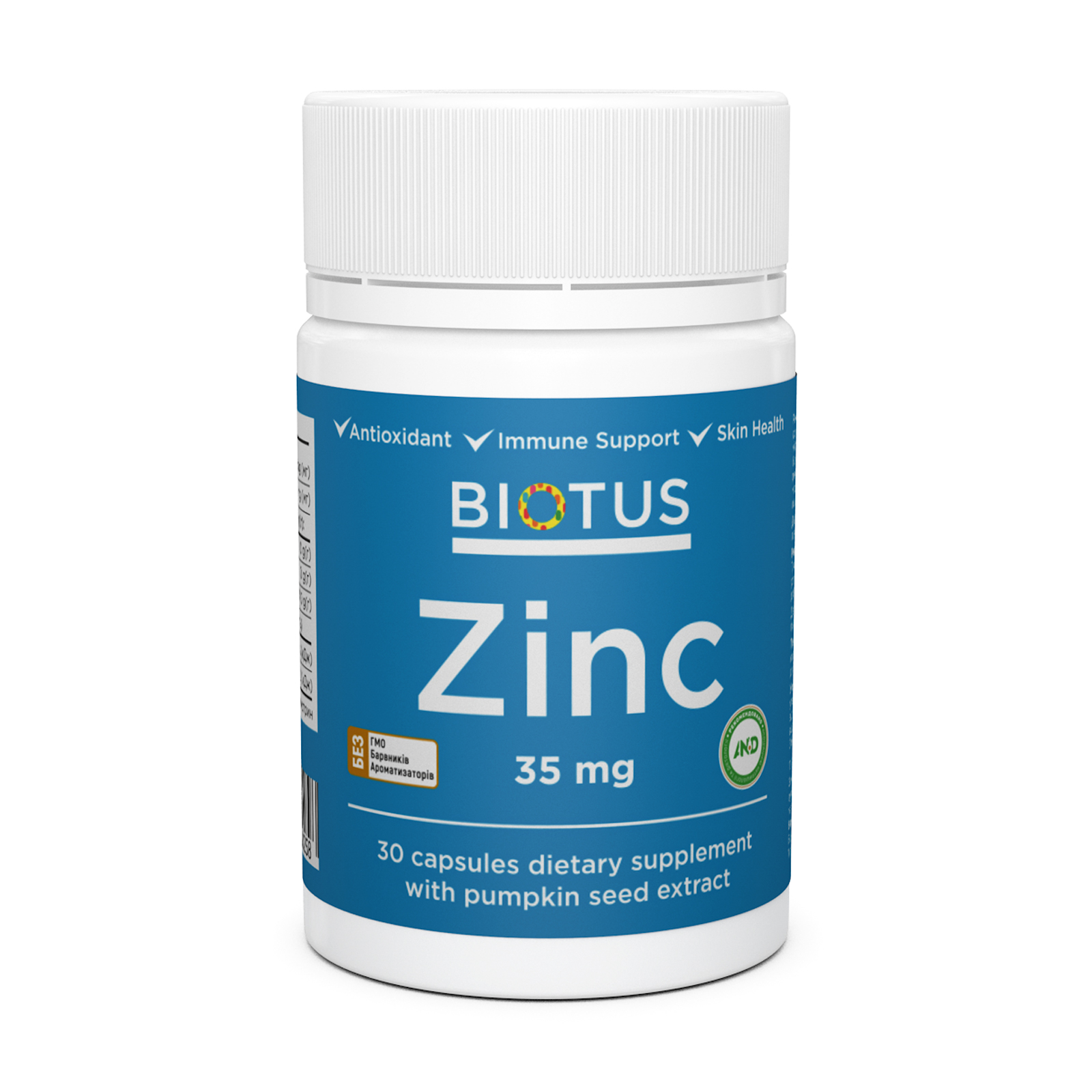 Цинк від українського бренду Biotus є джерелом натурального цинку (з екстракту гарбузового насіння) і оксиду цинку