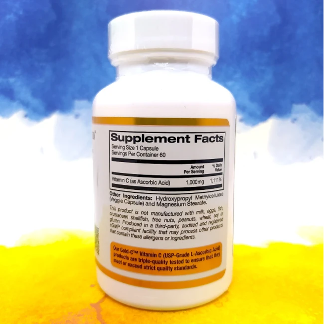 Вітамін С у капсулах у високій дозі - 1000 мг, для підвищення імунітету, зниження застуд, а також поліпшення засвоєння колагену для суглобів, волосся, нігтів та шкіри. California Gold Nutrition Gold C Vitamin C 1000 mg випускається в США, у фасуванні 60 капсул і вважається топовим американським маренням з виробництва добавок для здоров'я.