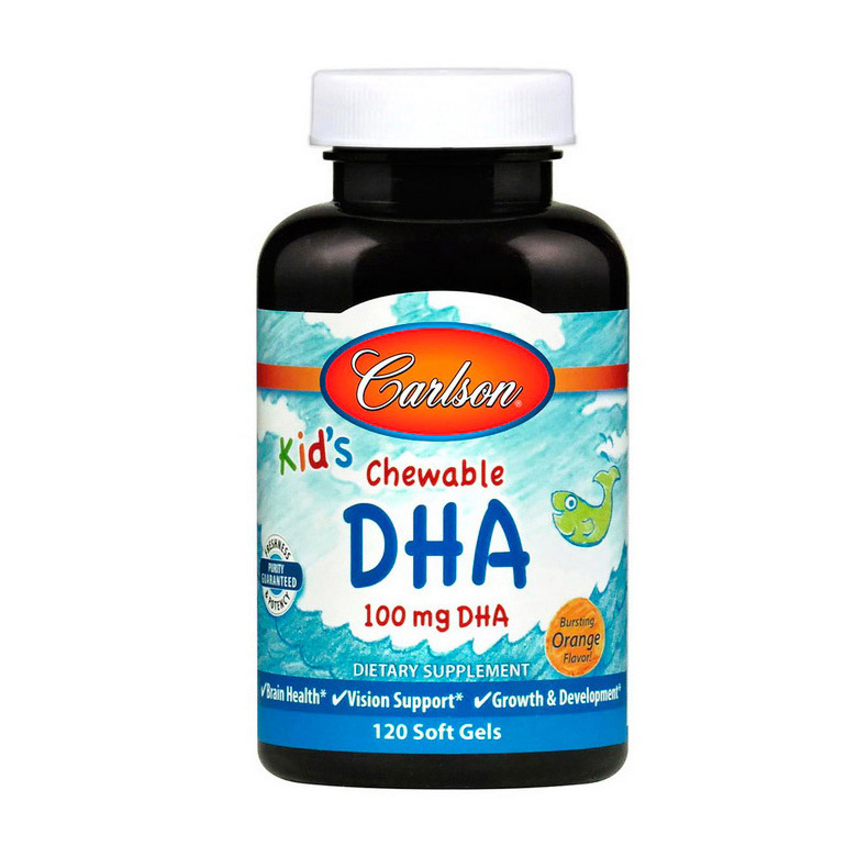 Дитячий риб'ячий жир з великою кількістю омега 3 жирних кислот, застосовують для здоров'я серця, мозку та зору. Carlson Labs Kid's Chewable містить DHA 100 mg, EPC 50 mg і випускається у фасуванні 60 і 120 капсул зі смаком апельсина.