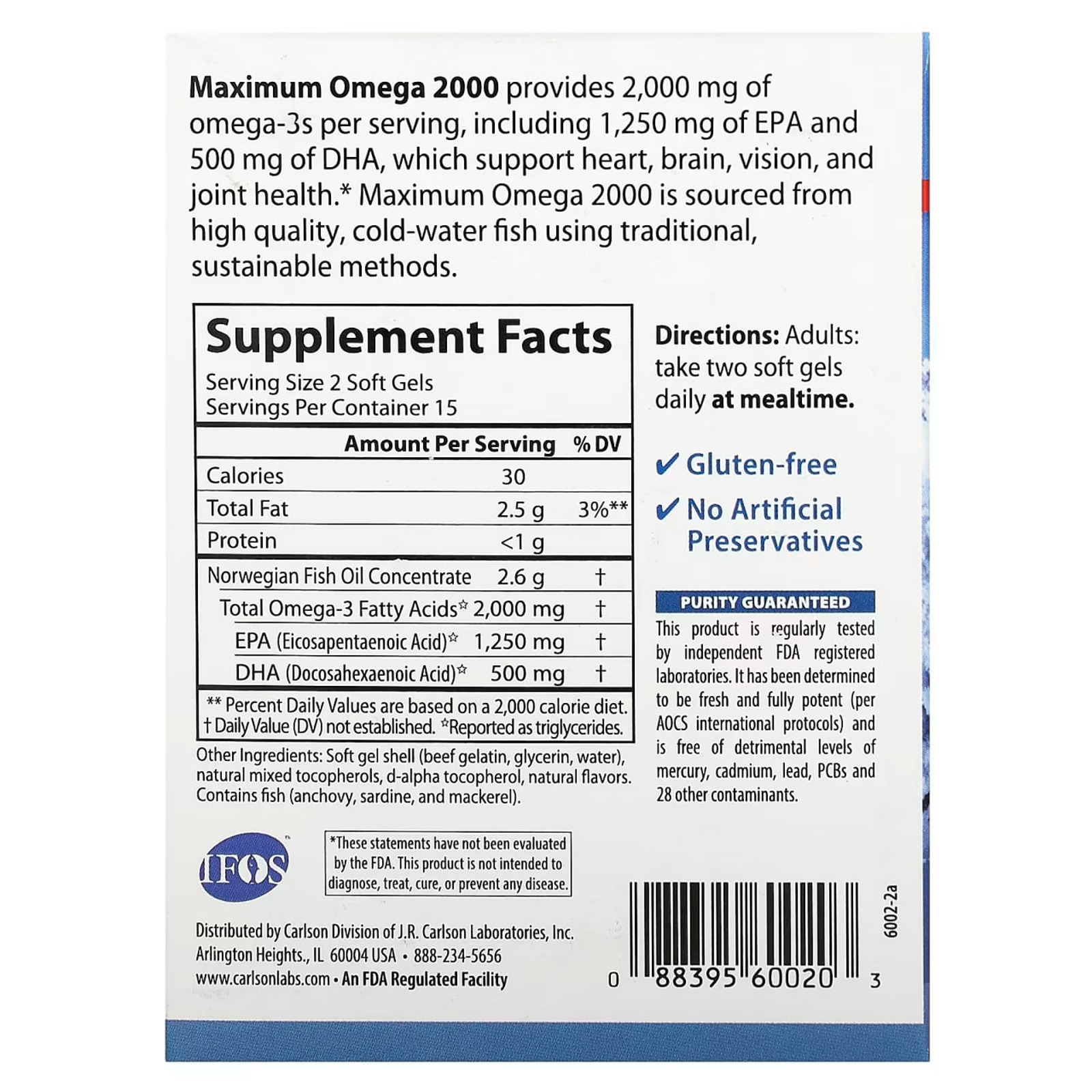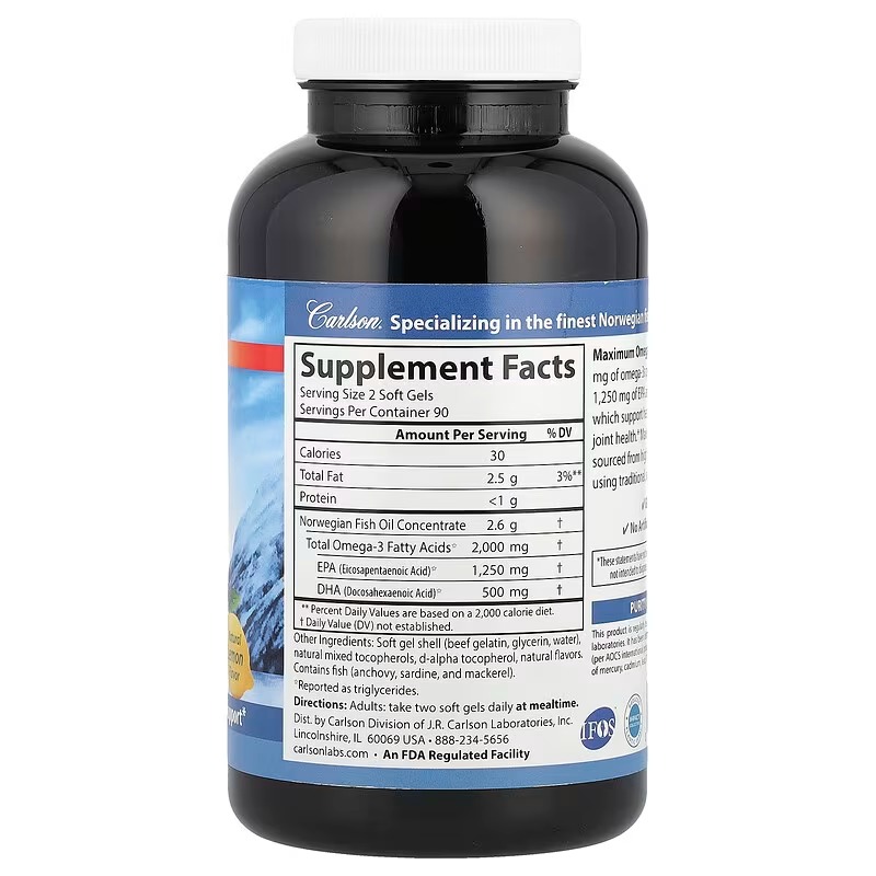 Carlson, Wild Norwegian, Maximum Omega 2000, Natural Lemon, 2,000 mg, 180 Soft Gels (1,000 mg per Soft Gel)