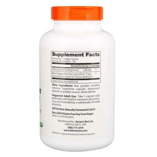 Високозасвоюваний коензим Q10 у дозуванні 100 мг з додаванням біоперину для максимального ефекту. Doctor's BEST High Absorption CoQ10 100 mg with BioPerine випускається у фасуваннях 60 і 120 капсул, призначений для зміцнення серця, і поліпшення виробництва енергії (не належати до стимуляторів, або енергетиків).