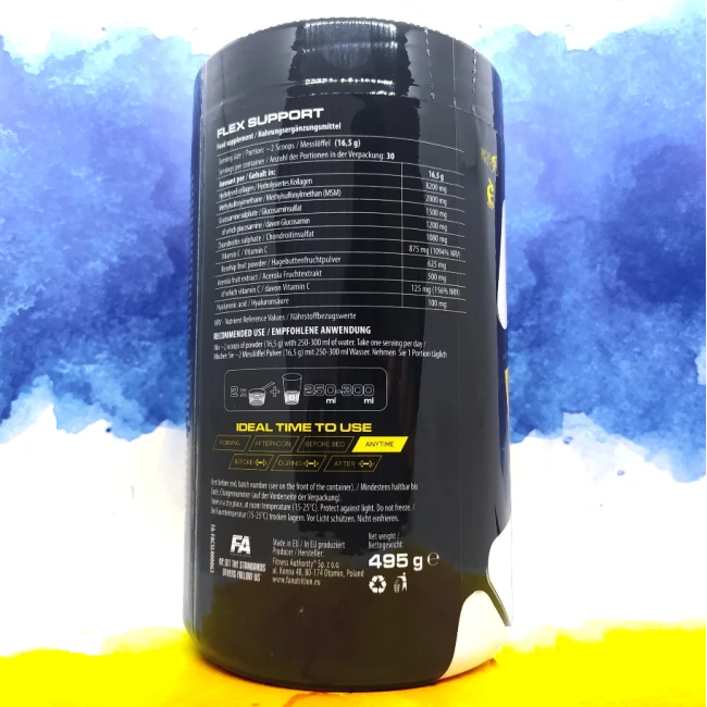 Багатокомпонентна формула створена для підтримки здоров'я людей різного віку та фізичного навантаження. В першу чергу для тих, хто піддає своє тіло важким навантаженням, зношуючи суглоби і займаючись травмонебезпечними видами спорту. Але добавка виявилася настільки ефективною, що стала затребувана у широкому колі людей. Головну роль у ній відіграють компоненти, які не завдають шкоди при необхідній дозі, а надають лише позитивний ефект – хондроїтин, глюкозамін та МСМ. Для посилення дієвості добавки у FA Flex Support Collagen йдуть додаткові компоненти, такі як: гіалуронова кислота, глюкозамін сульфат, екстракт плодів ацероли та вітамін С.