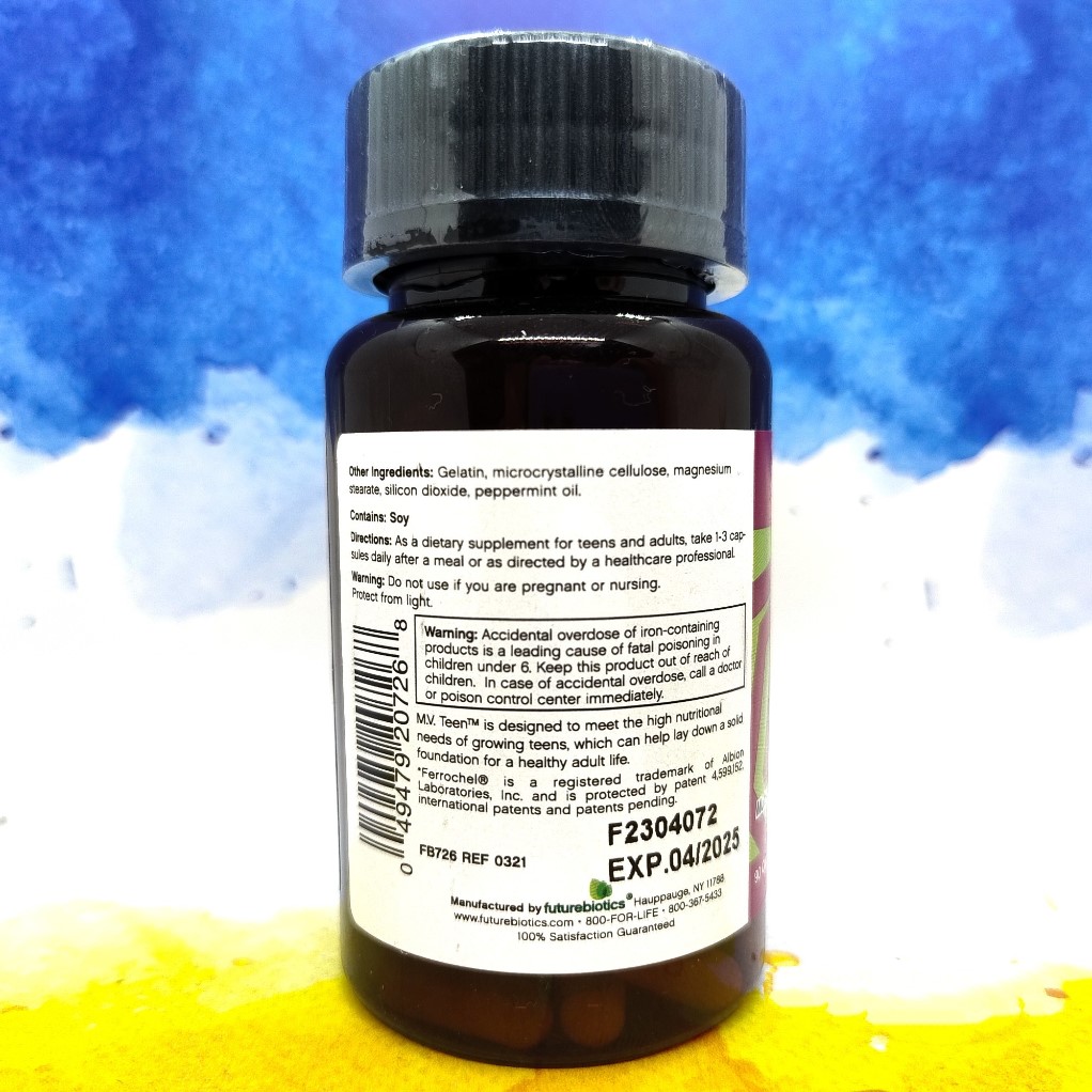 З великим навантаженням, з яким стикається підлітковий організм, потрібна висока вітамінна підтримка. Мультивітаміни FutureBiotics M.V. Teen покривають потребу молодого організму на 100% і покращують загальне самопочуття. Вітаміни допомагають легше справлятися з емоційними та стресовими навантаженнями. Вони так само необхідні для розвитку кісток, м'язів і мозку. Отримуючи вітаміни в достатку, підліток ставатиме уважніше, енергійніше і здоровіше. FutureBiotics M.V. Teen призначений підтримати організм у підлітковому віці.