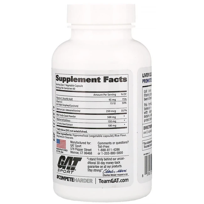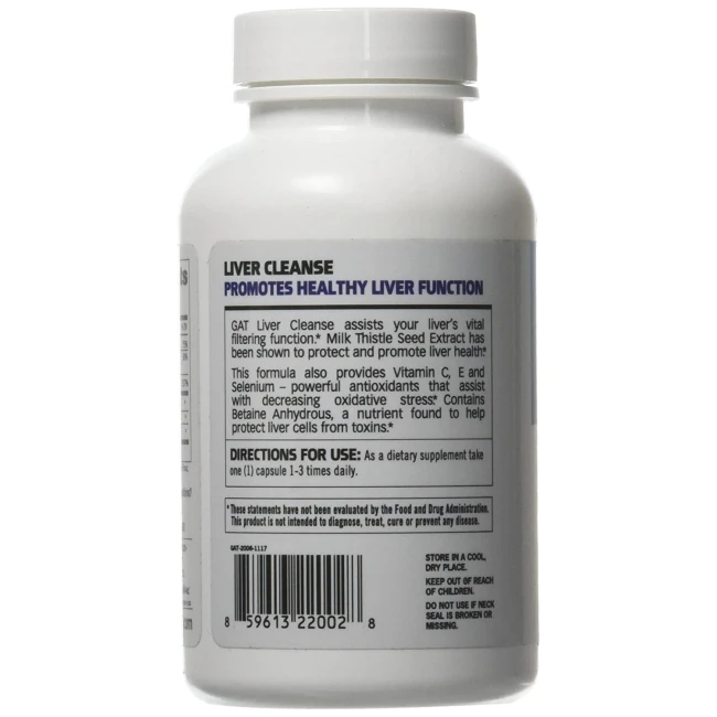 Добавка на рослинній основі для відновлення клітин печінки містить розторопшу, селен, бетаїн, куркуму та інші корисні компоненти для здоров'я. GAT Liver Cleanse випускається у США у фасуванні 60 капсул.