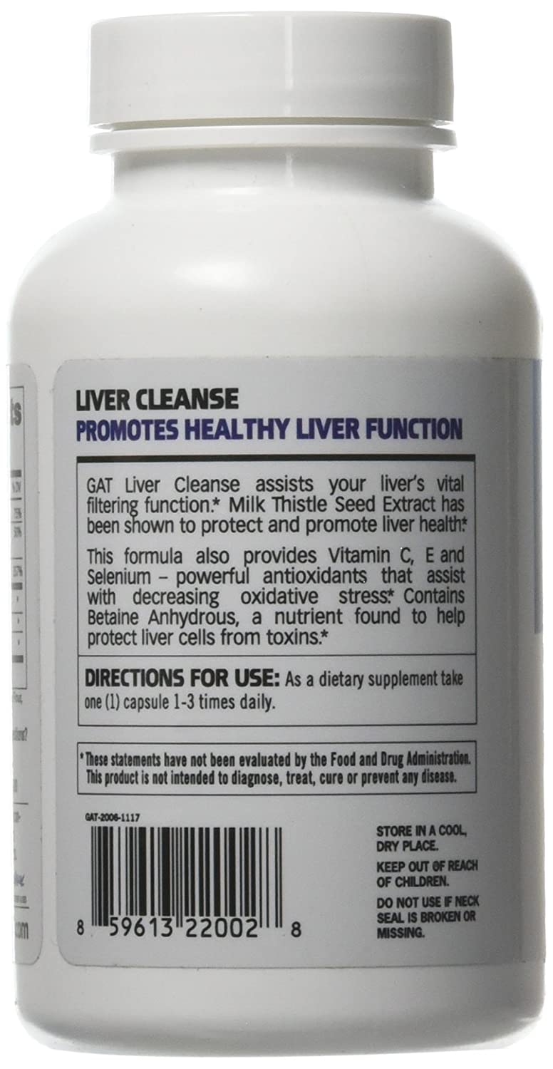 Добавка на растительной основе для восстановления клеток печени, содержит расторопшу, селен, бетаин, куркуму и другие полезные компоненты для здоровья. GAT Liver Cleanse выпускается в США в фасовке 60 капсул.