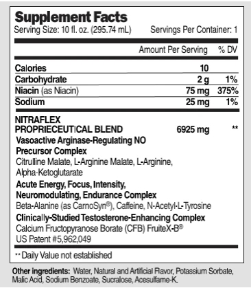 Жидкий пред тренировочный комплекс без добавления креатина, для повышения силовых показателей и выносливости. GAT Nitraflex выпускается в бутылка объёмом по 295 мл, в блоке содержит 20 штук. В данном предтрене используется лишь проверенные, безопасные и эффективные стимуляторы: кофеин, бета-аланин, цитруллин, аргинин и тирозин.