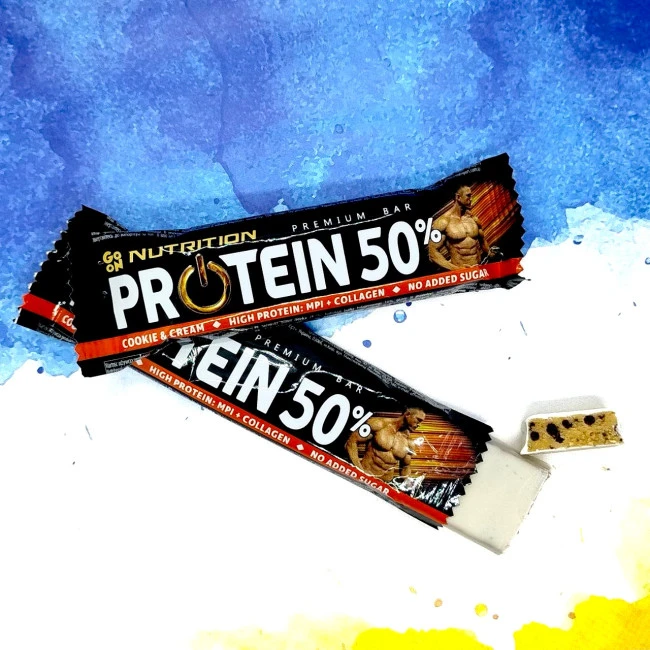 GoOn Nutrition Protein Bar 50% має чудовий смак вершків і печива з додаванням пластівців какао. Батончик забезпечує 20 г білка і всього 161 ккал, тому є чудовою альтернативою калорійним шкідливим солодощам. Відрізняється високим вмістом білка, який сприяє нарощуванню м'язової маси та прискорює регенерацію після тренування.