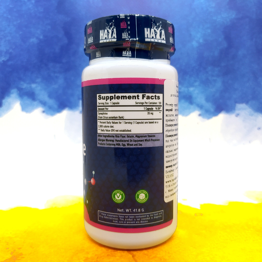 Синефрін є адаптогеном, що покращує адаптацію людського організму до стресових факторів. Цей алкалоїд природно міститься в деяких цитрусових. Має сильну термогенну дію або, простіше кажучи, може підвищувати температуру тіла. Haya Labs Synephrine прискорює обмін речовин, підвищує енергію та пригнічує апетит, таким чином бере активну участь у спалюванні зайвого жиру. Синефрин стимулює центральну нервову систему, підвищуючи концентрацію та підтримує серцево-судинну діяльність.