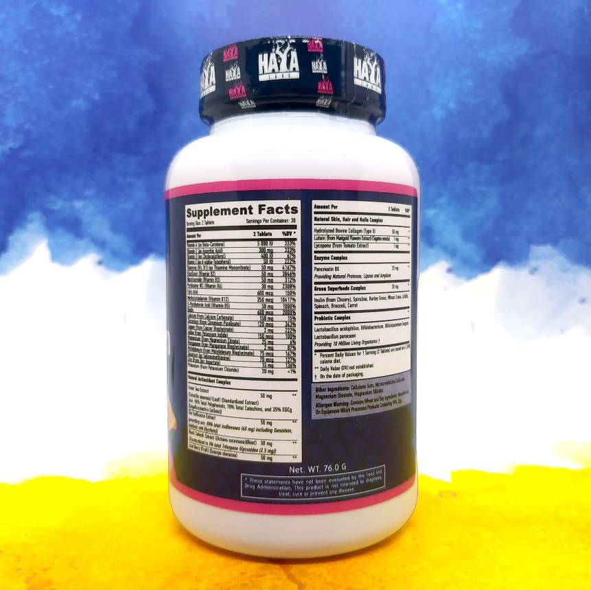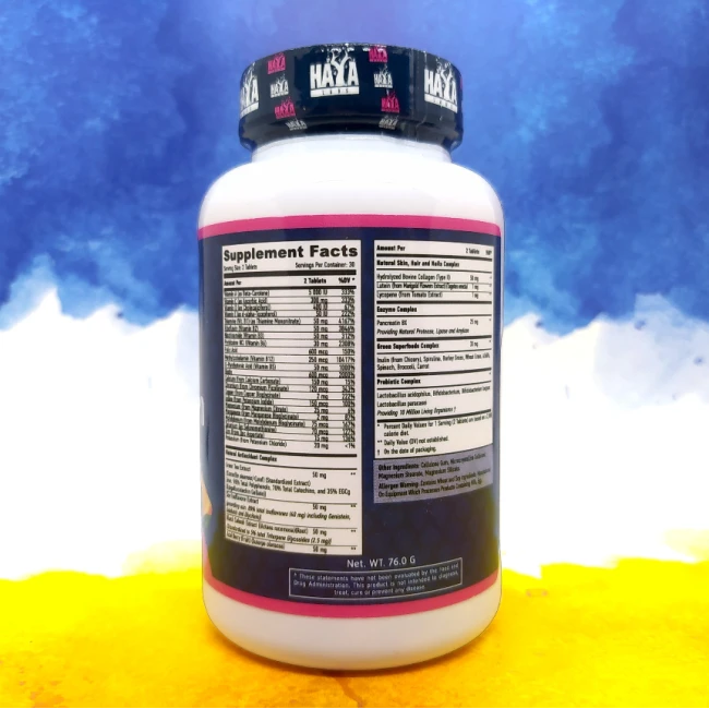 Обширний склад у потрібній дозі різних вітамінів, мінералів, ферментів та пробіотиків, необхідних для здоров'я та нормального розвитку кожної жінки. Haya Labs Women's Multivitamin містить екстракти зеленого кипарису, броколі та шпинату – незамінні речовини, які допомагають жіночому здоров'ю. Колаген, лютеїн і лікопін, що входять до складу, підтримують волосся, шкіру і нігті. Життєво важливі ферментні компоненти в організмі підтримують систему обміну речовин та боротьбу з макроелементами.