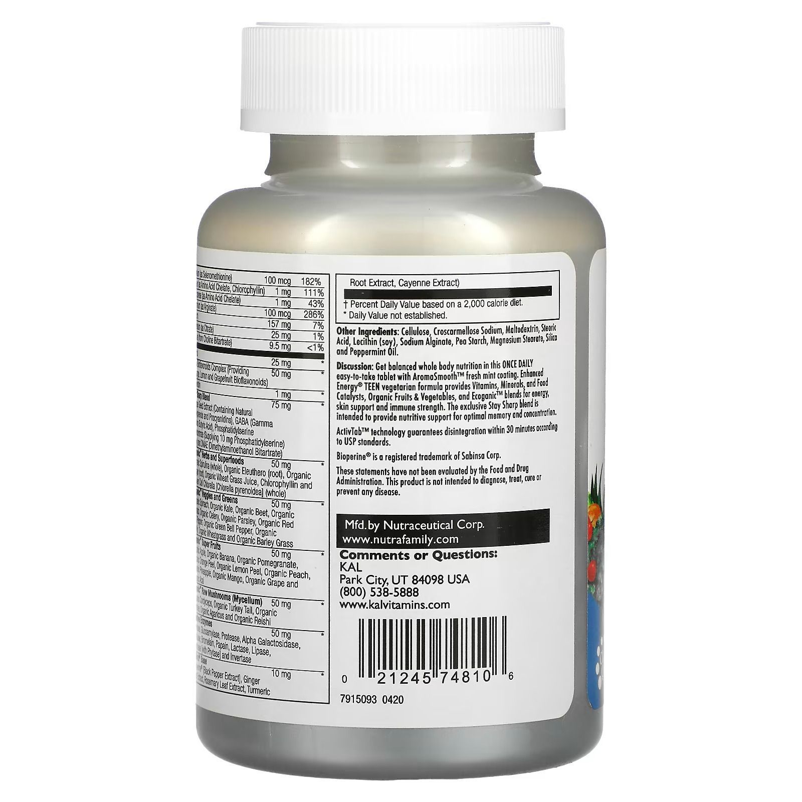 Харчова добавка для підлітків у веганських капсулах. KAL Enhanced Energy Teen Stay Sharp Multivitamin містить комплекс мультвітамінів, які підтримують здоров'я підліткового організму і включає корисні компоненти суміші овочів і фруктів.