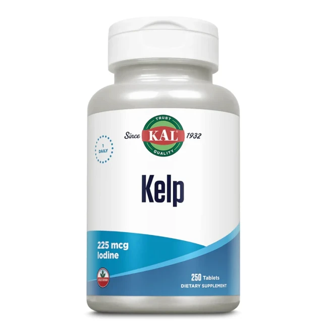 Келп - це бура водорість, що росте в океанах і морях. Вона є багатим джерелом йоду, що підтримує обмін речовин щитовидної залози. KAL Kelp Iodine 225 мкг призначений для підтримки здоров'я щитовидної залози, яка відповідає за безліч функцій в організмі людини.