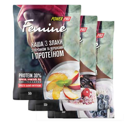 Відмінна харчова добавка для спортсменів, які хочуть вранці трохи довше поспати, а не тупцювати сонним біля плити, намагаючись зварганити по-швидкому щось смачне та корисне. Каші популярного українського виробника Power Pro - це просто супер смачний сніданок, який до всього іншого ще містить у своєму складі сироватковий протеїн. Каша 3 злаки Power Pro Femine дуже проста в приготуванні, містить аж 30% протеїну, і при цьому ще й має прекрасний смак, що-що, а дійсно смачні, фахівці Повер Про свою продукцію робити вміють. Випускається зараз протеїнова каша в пакетиках з такими смаками: вишня, персик і чорниця.