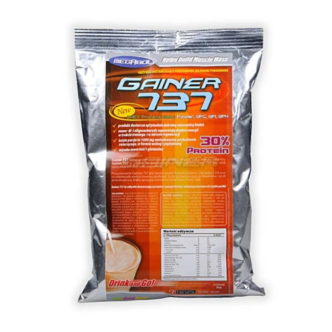 Gainer 737 - білко-вуглеводна добавка у співвідношенні 30 білків, 60 вуглеводів та 10 грам зі 100 на вітаміни та амінокислоти, без додавання цукру та підсолоджувачів з невеликим додаванням вітамінів від польського виробника Megabol. Добавка створена для покращення спортивних показників при інтенсивних навантаженнях, а саме для збільшення м'язової маси та силових показників.