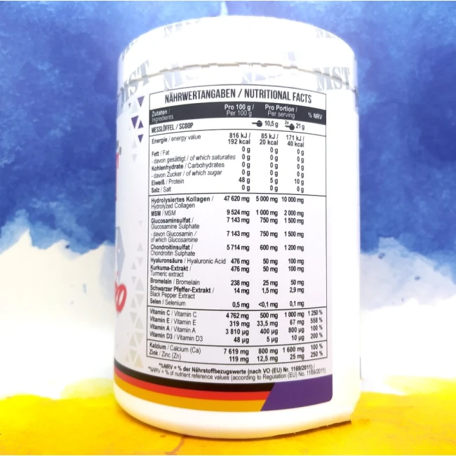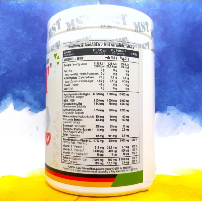 Порівняно з аналогами, колаген йде в більшій дозі в MST FleX Pro . На що він впливає і чим він так необхідний? Гідролізований колаген є очищеним різновидом білка. Така форма колагену найкраще підходить для суглобів, зв'язок та сухожилля. Як білок є будівельним матеріалом для клітин, так і колаген виконує роль захисту опорно-рухової системи. Він зміцнює, відновлює та зберігає тканини.