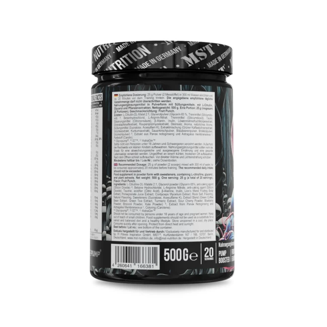 Предтренувальна добавка без кофеїну та інших стимуляторів, з новим сучасним складом для підвищення пампу, фокусування та витривалості. MST Neuro Pump підвищує силу та стабілізує молочну кислоту - більше повторень, та кращий зріст м'язів. В складі присутні як стандартні амінокислоти типу аргінін, цитрулін, бета-аланін, так і гриби, та різні натуральні рослини які збільшують оксид азоту до 230%.