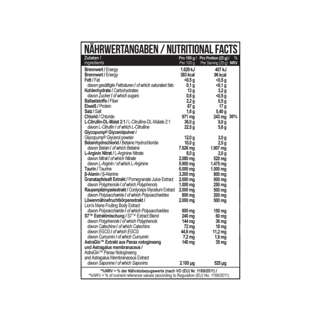 S7™ Extract Blend. Запатентований комплекс суміші 7 рослин. S7™ Extract Blend збільшує оксид азоту до 230%. Підсилює показники сили та витривалості, стимулює обмін речовин у тканинах та загалом надає користь на серце, печінку, нервову систему тощо.