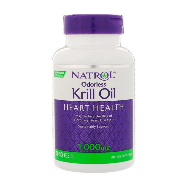 Олія криля концентрат містить подвійне дозування корисних жирів на кожну капсулу. Natrol Odorless Krill Oil Heart Health містить 1000 mg олії криля Superba і випускається в США у фасуванні 30 капсул. Хочемо відзначити велику кількість фосфоліпідів у складі та омега жирних кислот, що робить добавку ще кориснішою за її аналоги, а також те, що у виробництві використовується саме антарктичний криль з екологічно чистих місць нашої планети.