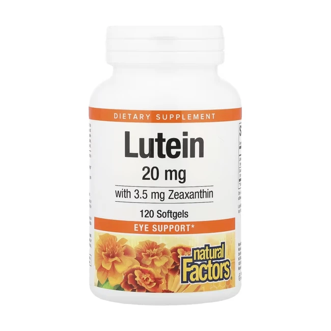 Харчова добавка на основі лютеїну для підтримки зору. Natural Factors Lutein 20mg with Zeaxanthin 3.5mg випускається у фасуванні 60 та 120 гель-капсул.