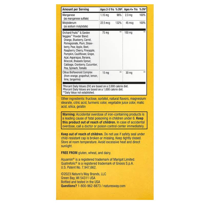 Kids Chewable Multivitamin допомагає дитині зберігати міцне здоров'я та розвиватися з повними силами та енергією. Мультивітаміни підтримують міцні кісткові тканини, сильну імунну систему та активну роботу мозку. Якість інгредієнтів знаходиться на найвищому рівні. У складі немає штучних барвників, генних модифікацій, штучних елементів та хімічних добавок. Мультвітаміни від Nature's Way пройшли строгий стандарт якості. Все для того, щоб ваша дитина росла здоровою і радісною.