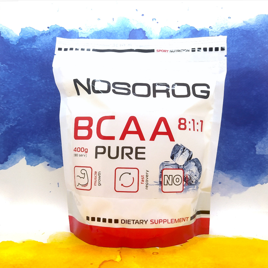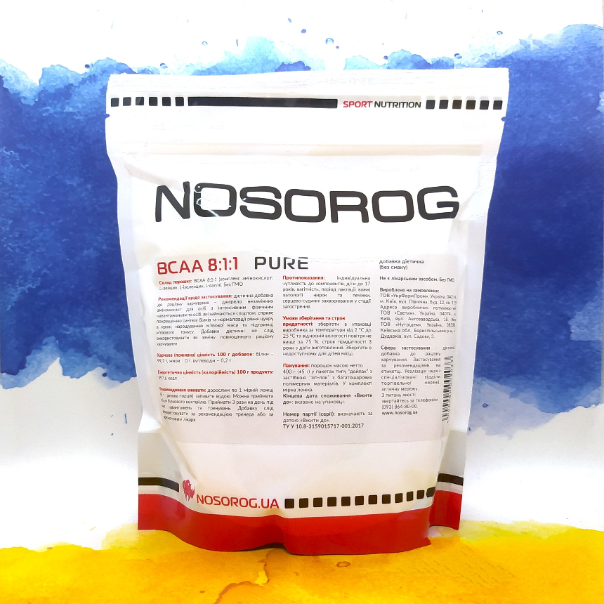 Комплекс BCAA від українського виробника спортивного харчування Nosorog. Добавка Nosorog ВСАА 8:1:1 призначена для зміцнення, відновлення та зростання м'язової маси. Співвідношення лейцину, валіну та ізолейцену 8:1:1 - ідеально підходить на період сушіння. У продажу є фасування - 200 і 400 грам, без смакових добавок.