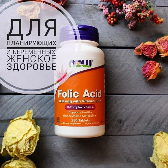 Добавка призначена для помітного збільшення енергетичного обміну, покращеного транспортування кисню, профілактики онко захворювань, та формування нових клітин. В основному використовується при плануванні, і під час вагітності, для запобігання патологіям нервової трубки плода, і нормальному розвитку ембріона. Препарат NOW Folic Acid 800 mcg з Vitamin B12 виробляється на американському заводі спортивного харчування у фасуванні 250 капсул. Серед переваг добавки можна особливо виділити високе дозування вітаміну В9, фармацевтичну якість вітамінів у складі та додаткове збагачення комплексу вітаміном В12.