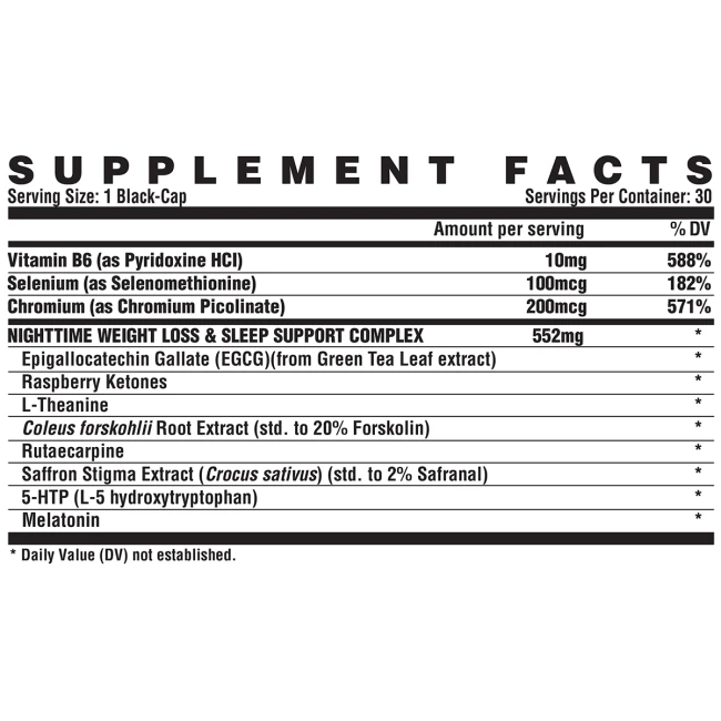 | Complex (комплекс) 1 | Нічний комплекс для схуднення та підтримки сну - 552 мг (EGCG (з екстракту листя зеленого чаю); малинові кетони; L-теанін; екстракт кореня (Coleus forskohlii) (стандартно до 20% форсколіну); рутакарпін; екстракт шафранових рильців (Crocus) (стандартно до 2% сафраналу); |