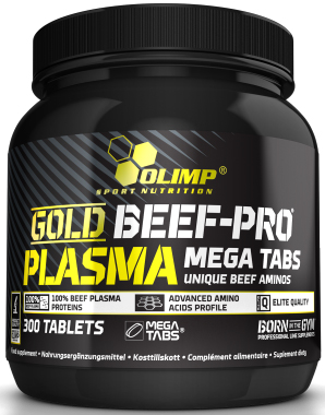 Комплекс яловичих амінокислот від польського виробника спортивного харчування OLIMP. Добавка Gold Beef-Pro Plasma призначається для збільшення та зміцнення м'язових волокон. Добавка також здатна ефективно пригнічувати процес катаболізму, і допомагає швидше відновлюватися після інтенсивних фізичних навантажень. У продажу є фасування 300 таблеток.