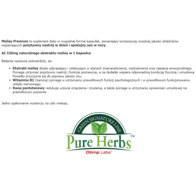 Добавка на травах меліси для гарного настрою та сну. Випускають OLIMP Melisa Premium у фасуванні 30 капсул і часто застосовують для заспокоєння центральної нервової системи або просто для релаксу. Меліса від Олімп містить екстракт листя меліси та вітамін Б1, який посилює ефект, адже також нормалізує роботу центральної нервової системи.