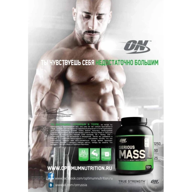 Високовуглеводний гейнер для якісного та швидкого набору маси Serious Mass від Optimum Nutrition – це збалансований продукт, який без проблем засвоюється організмом, а також має дуже приємний смак. Одна порція гейнера сиріус мас містить більше 1200 калорій - 50 грам білка, 250 грам вуглеводів, важливі для організму амінокислоти, вітаміни (включаючи також вітаміни A, C, D, E) і мікроелементи (йод, залізо, магній, цинк, селен т д.). Гейнер – це продукт, що допомагає набирати масу, рахунок поповнення основного раціону харчування відповідними білками і вуглеводами. Таке спортивне харчування як сиріус мас гейнер - дуже популярне серед тих, хто хоче швидко набрати м'язову масу, збільшити кількість калорій у щоденному раціоні без ризику відкладення підшкірного жиру.