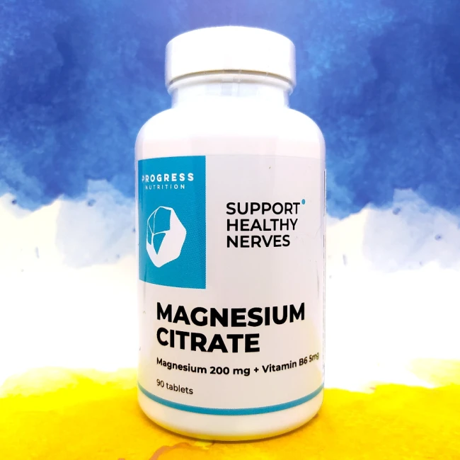 Progress Nutrition Magnesium Citrate + Vitamin B6 є корисним для тих, хто щодня стикається з важкими навантаженнями на організм. При стресі, хронічній втомі, депресивному стані, проблемами з когнітивними функціями та погіршенням зовнішнього вигляду цей препарат має на меті виправити те, що ускладнює життя. Магнію цитрат 200 мг на одну таблетку (400 мг на порцію) + вітамін Б6.