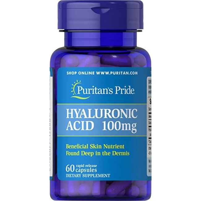 Спортивна харчова добавка для підтримки здоров'я шкіри, волосся та суглобів під назвою Hyaluronic Acid 100 mg, від знаменитого американського виробника спортивного харчування та добавок для здоров'я, компанії Puritan`s Pride. Hyaluronic Acid 100 mg містить 100 мг високоякісної діючої речовини на 1 капсулу, і вважається однією з найбільш високо концентрованих дозування добавок у своєму класі. Випускається у фасуваннях 30 та 60 капсул.