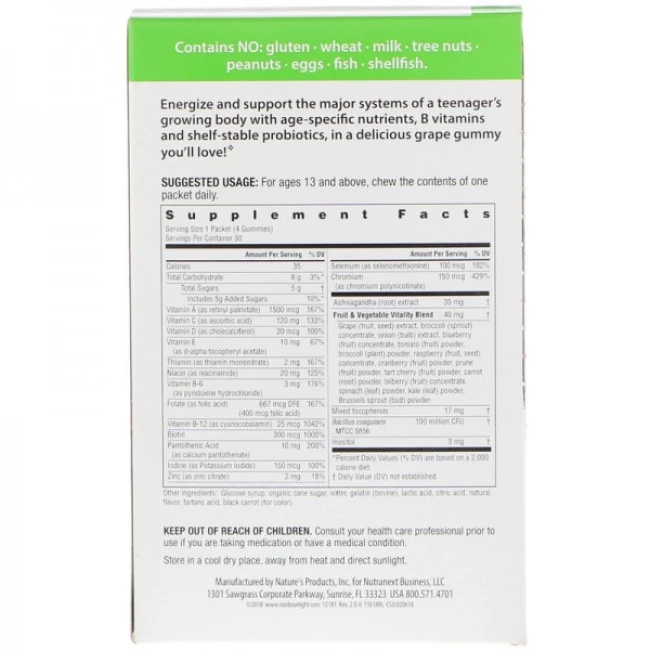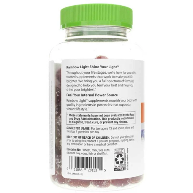 Вітаміни для підлітків преміальної якості, виробництва США у жувальній формі. Rainbow Light Teen Multivitamin Gummies випускається у фасуванні 100 та 120 жувальних мармеладок. Хочемо відзначити, що продукт не містить: глютену, пшениці, сої, молока, риби та інших алергенів.