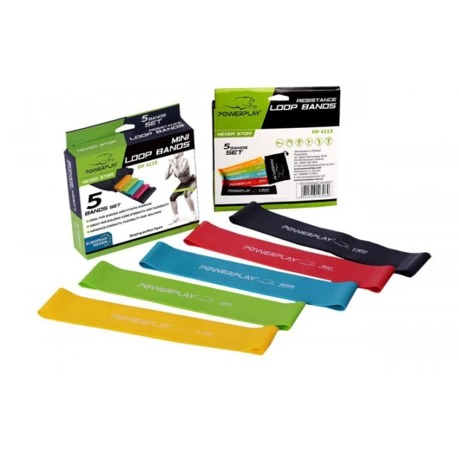 Набір кольорових фітнес резинок, кожен колір має різний тягар опору. Powerplay 4113 містить 5 резинок різних кольорів, за допомогою яких можна виконувати різні вправи та розведення у будь-якому зручному місці. У комплекті чохол для зручного користування та транспортування.