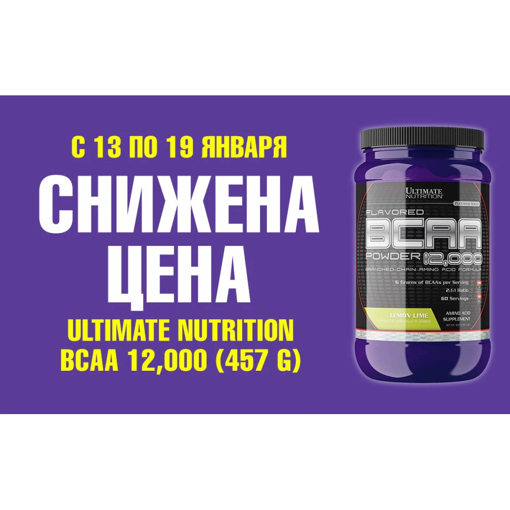 Внимание для любителей аминокислот BCAA 12000 от легендарного производителя спортивного питания Ultimate Nutrition. Купить BCAA 12000 можно по скидке до 19.01.2020 года. Напомним что аминокислоты бцаа одни из самых лучших аминокислот для восстановления мышц и их роста. Сейчас в интернете поднята тема мол всаа не работают, но те кто распространяют данную информацию не объясняют почему...