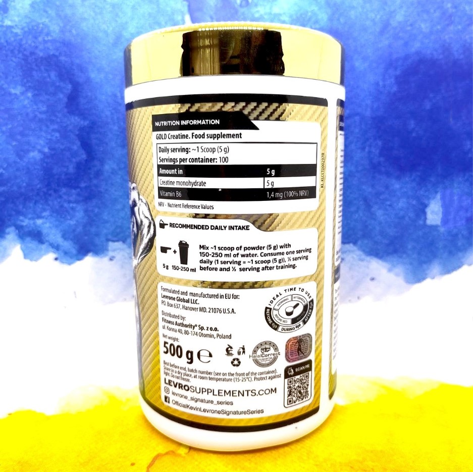 Креатин моногидрат от польского производителя спортивного питания. Чистый креатин моногидрат без каких либо вкусовых примесей и т.п. Исключением является добавление в состав Kevin Levrone Gold Creatine витамина Б6, который в свою очередь положительно влияет на выработку энергии, что в целом не плохо дополнит добавку. В остальном прием креатина предоставит вам следующие преимущества: