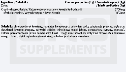 Гидрохлорид креатина о польского производителя спортивного питания UNS. Creatine HCL Extreme предназначен для увеличения силовых показателей, и выносливости. В частности креатин гидрохлорид, в отличии от аналогов, лучше растворяется, не требует транспорта, и не задерживает воду. Доступная в продаже фасовка - 300 грамм. Вкусы: яблоко, киви, лимон, апельсин, малина, ананас.