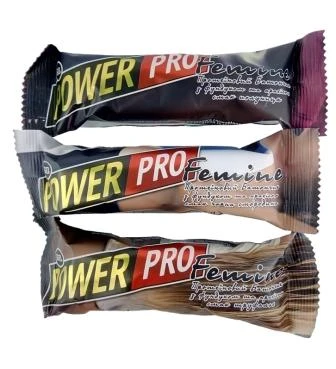 Женские батончики Power Pro Femine, по сути, как и обычные 36% по составу, только с небольшим изменением в витаминном составе и вкусовых вариантах. Выпускаются в таких вкусах: клубника со сливками, смородина, труфалье и blue curacao.