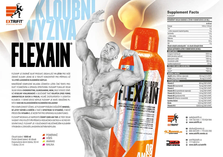 Пожалуй одним из наиболее востребованных на сегодняшний день хондропротектором является комплексный препарат чешского производства, под названием Flexain, от компании производителя спортивного питания Extrifit. Эта добавка заслужила доверие огромного числа пользователей в первую очередь за очень широкий состав, в который помимо глюкозамина, хондроитина и мсм входят так же кальций, магний, коллаген, гиалуроновая кислота, и еще целый комплекс веществ, направленных на здоровье суставов и костей. Вторым, не менее важным фактором, играющим на пользу этого препарата является высокое качество сырья на фоне довольно низкой стоимости.