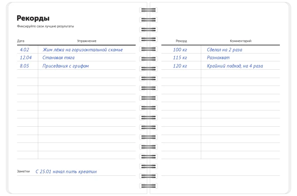 Следующим не маловажным этапом наших тренировок должно стать заведение дневника результатов. Мы кстати можем Вам сделать распечатку для записей своих достижений совершенно бесплатно, просто упомяните об этом менеджеру, принимающему ваш заказ. Каждую неделю мы по немногу увеличиваем количество повторений или рабочий вес в подходах, и скурпулезно фиксируем это в свой дневник. Прибавлять сразу 10 кг не стоит, достаточно будет и 0,5-1 кг, ведь на следующей неделе нужно будет прибавлять снова. Обратите внимание на технику выполнения упражнений, рекомендуем как минимум несколько раз просмотреть в ютубе правильность выполнения у профессионалов. К примеру, Станислав Линдовер, довольно таки подробно показывает как правильно делать, но конечно же лучше хотя бы 5 тренировок взять у тренера. Если тренера нет, выполняйте упражнения перед заркалом сверяя свою технику выполнения с увиденным на видео.