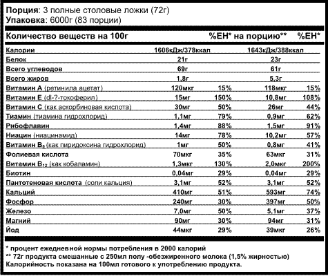 - Углеводное содержание состоит из разных видов углеводов, с разным периодом усваивания, что обеспечивает постепенную подачу калорий в течении длительного периода.