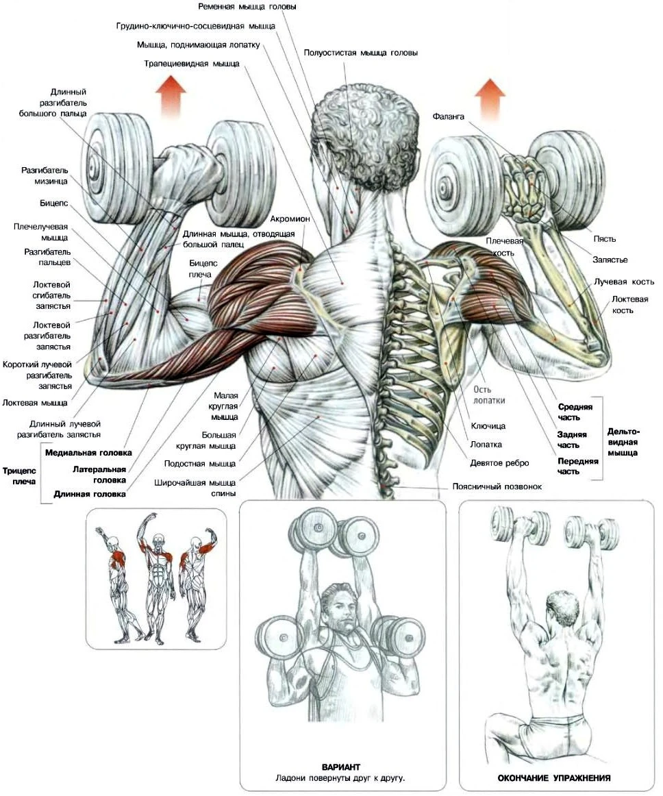 - Жим гантелей сидя 12 х 4 + махи гантелей в стороны 12 х 4