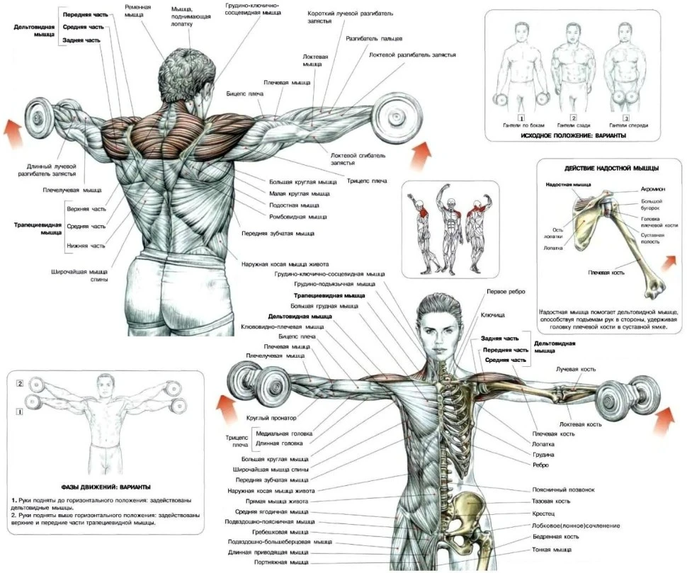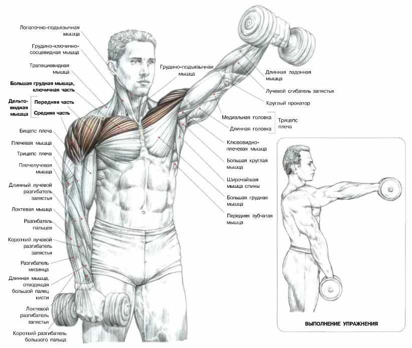 - Жим штанги стоя с груди 12 х 4 + махи гантелями вперед 12 х 4