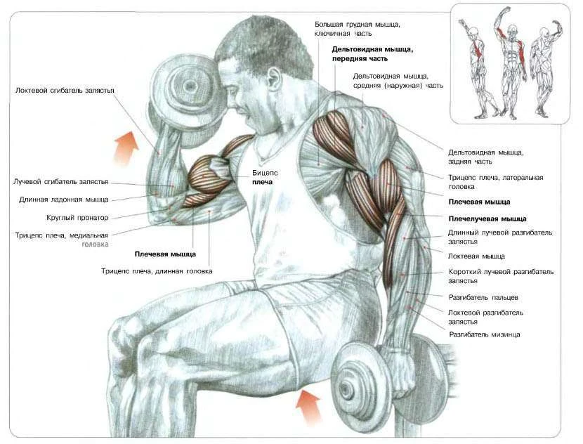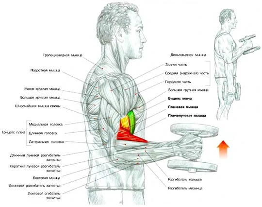 - Сгибание рук со штангой стоя 12 х 4 + сгибание рук сидя с гантелями под углом 15 х 4 + молотки стоя 15 х 4