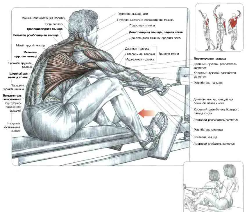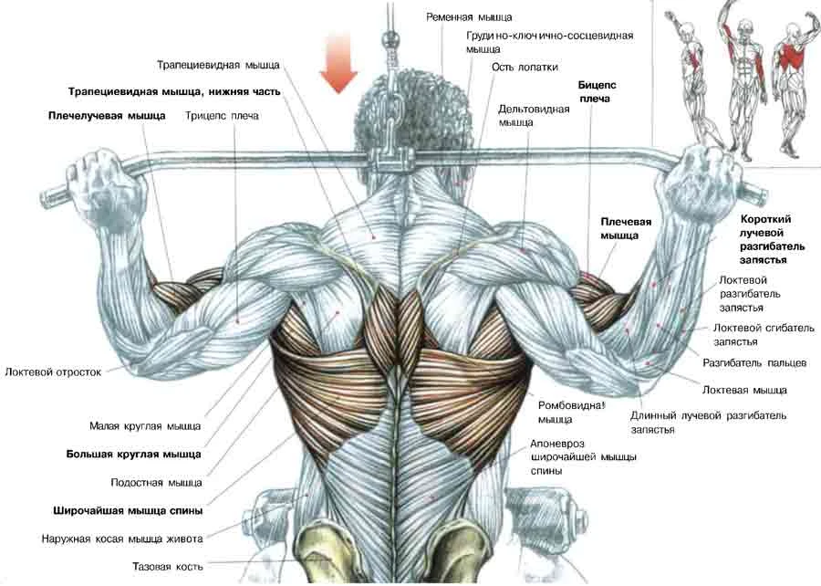 - Тяга блока широким хватом 15 х 4 (менее травмоопасно делать перед грудью, а не за голову)