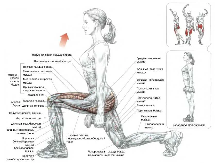 - Выпады с гантелями на месте 15 х 4 (на каждую ногу, сначала на одну, потом на вторую, некоторые выполняют данное упражнения шагая по всему залу, но это менее эффективно плюс травмоопасно для позвоночника)